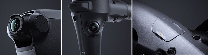 Курсовая камера Inspire 3 имеет 1/1,8" матрицу, отличается высокой светочувствительностью. Угол обзора (DFOV) удвоен и составляет теперь 161°. Снимает видео в 1080р при 60 кадр/с. По ней комфортно летать даже ночью.